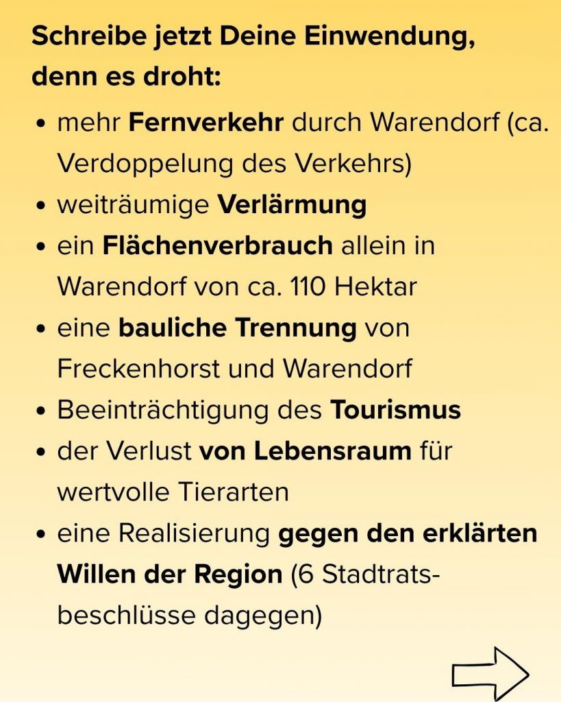 In Warendorf ist das Planfeststellungsverfahren zum Bau der B64n eingeleitet. Bis zum 19. Dezember 2025 kann jede und jeder einen Einwand schreiben, um Bedenken zum geplanten Projekt zum Ausdruck zu bringen. Jede Einwendung muss geprüft werden! Nur Personen, die im Verfahren Einwände vorbringen, werden informiert und angehört (s.u.).