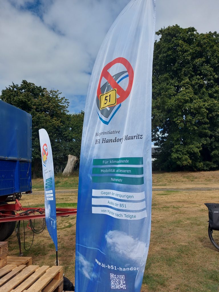 Am 23. August 2025 organisierten die 6 BI’s aus Handorf,  Telgte, Warendorf,  Beelen und Herzebrock-Clarholz gemeinsam eine Sternfahrt mit Fahrrädern und Treckern über die B51 und B64 nach Warendorf. Eindrucksvoll versammelten sich ca. 1000 Teilnehmer und 75 Trecker auf dem Lohwall zur gemeinsamen Kundgebung. Auf dem Podium sprachen sich die Bürgermeister aus Warendorf (Peter Horstmann) und Telgte (Wolfgang Pieper) neben Paul Afhüppe (Landwirt aus Warendorf), Matthias Jung (Unternehmerinitiative aus Warendorf) und Reinhold Schoppmann (Vertreter der beteiligten BI’s) entschieden gegen die jetzigen Ausbauplanungen aus. Sie forderten im Sinne der Demokratie die Landes- und Bundespolitik auf, sich den Beschlüssen aller betroffenen Stadt-und Gemeinderäte anzuschließen,  die jetzigen Planungen sofort zu beenden und sich für ein Moratorium bis zu einer Revision des Bundesverkehrswegeplans einzusetzen.  Angesichts der Klimakrise und des ungebremsten Flächenverbrauchs ist die bisherige Verkehrspolitik so nicht mehr akzeptabel.